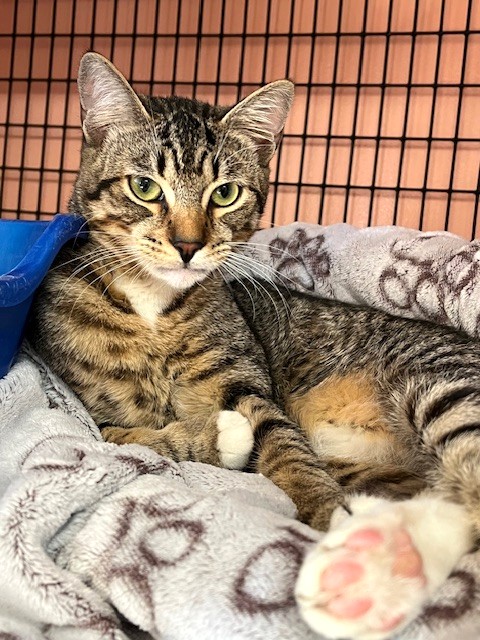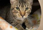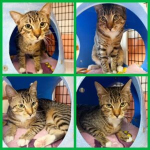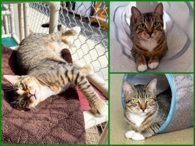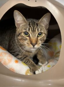 Hi, I’m Peter. My brother, sister, and I were put in a box. The box had some holes punched in it so we could breathe, and it was taped shut so we couldn’t escape. The box was left in an alley by some dumpsters and discovered by a man who was throwing out his trash. He heard us before he could see us, and when he opened the box, he couldn’t believe he had found three healthy, friendly cats. He kept us for a few days but couldn’t give us permanent homes, so he brought us to SBACC. We are all friendly, affectionate, and love attention, and my siblings have both been adopted! So now it’s my turn! I’m past the crazy kitten stage but still full of kitten energy. I think I’d like another young cat or kitten in my forever home so I’ll have a playmate!