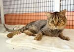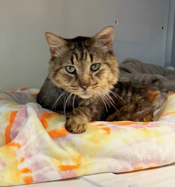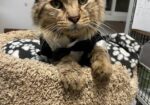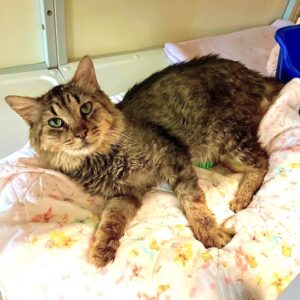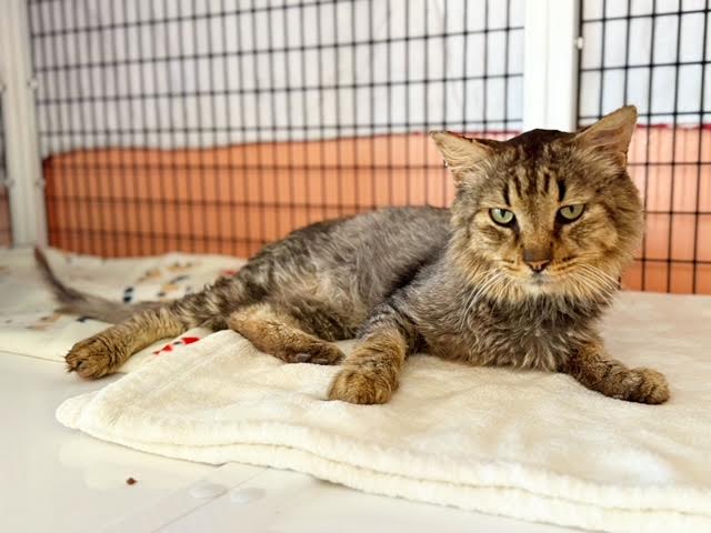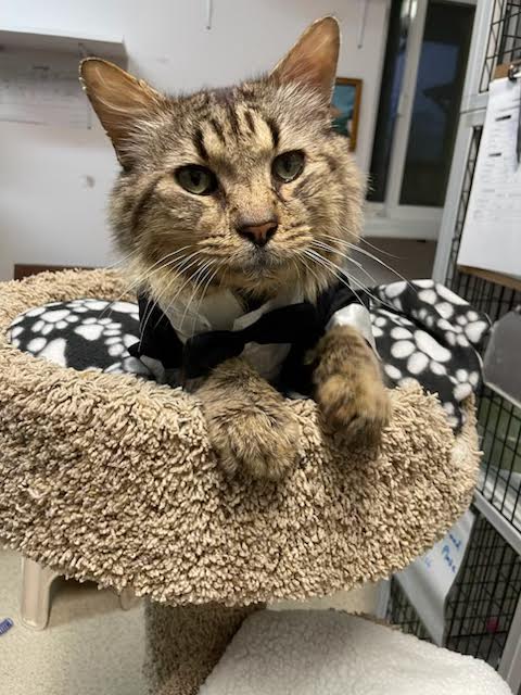 Hi, I’m Scrumps. I had been living on the street for months and being fed by a very kind couple.  Their neighbors weren’t so kind and often knocked over my food and water and shooed me away.  Some of the neighborhood kids chased me, attacked me, and threw things at me.  The couple who were feeding me knew I needed help because I was looking awful, but they couldn’t afford to take me to a vet.  They appealed for help on Nextdoor.com and caught the attention of an SBACC volunteer, who then brought me to SBACC.  I was in terrible condition, dehydrated, emaciated, and so flea-infested that my coat was covered with dirty, wet mats from me biting at myself.  My mouth was in such bad shape that I could barely eat, and I smelled awful.  I also had a severe URI and was extremely congested.  At the vet, I  was found to be FIV+ and to have stomatitis, which eventually led to me having a full mouth extraction.  My mats were so tight that I had to be shaved to allow all my hot spots to heal.  I was treated with daily subcutaneous fluids, antibiotics, nebulization twice a day, pain meds, a special mouthwash, and fed softened food. Despite all this, I am super friendly and affectionate, very vocal, and enjoy attention.  It took over a month, but I’m finally on the mend.  My fur is growing back, the awful odor is gone, I’m eating up a storm, and my congestion is nearly gone.  I’m finally ready to find my forever home — will it be with you?