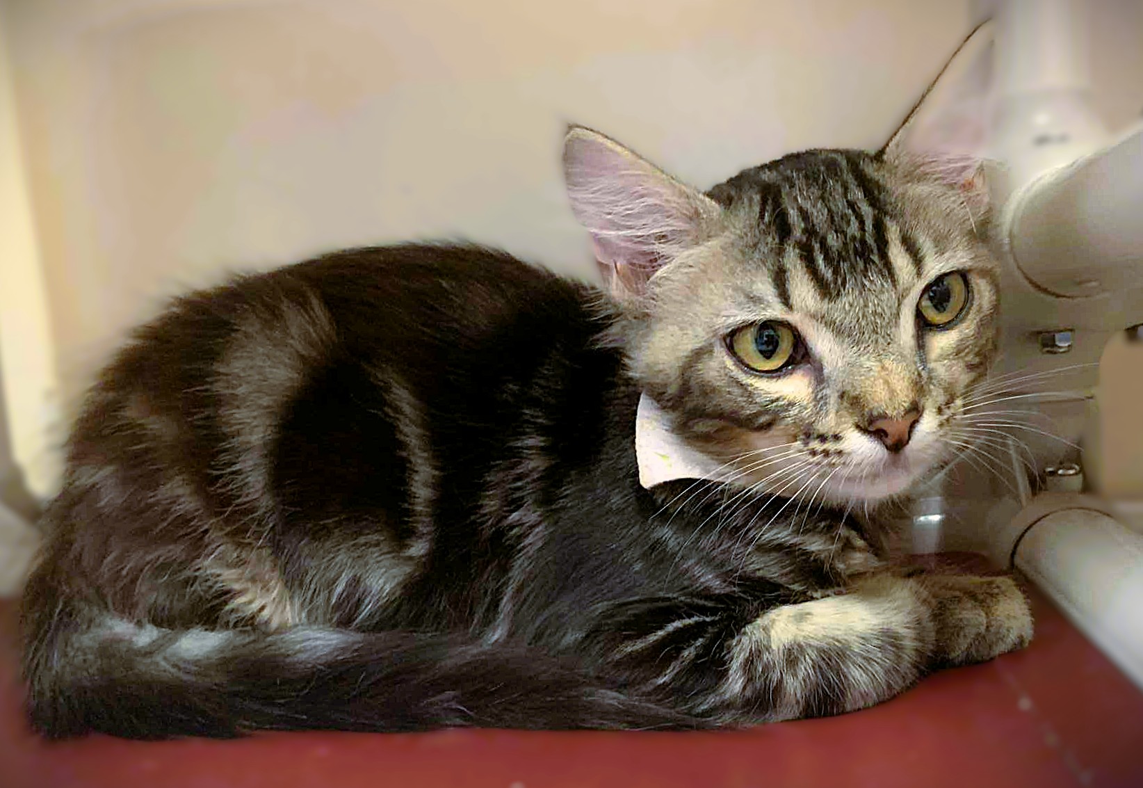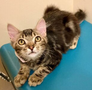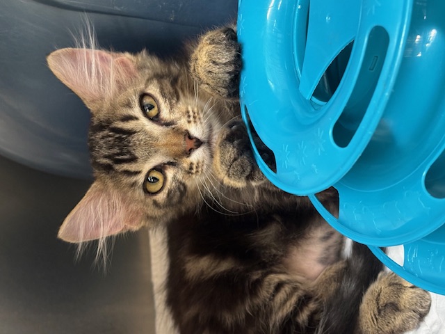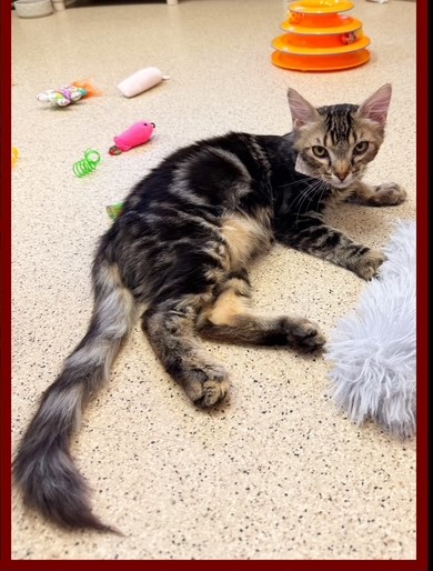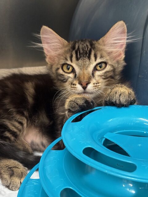 Hi, I’m Tree. My brother, Temple, and I, along with three other kittens, were rescued from an alley behind a homeless shelter. We were about two months old and barely alive. I couldn’t even stand up. We were severely malnourished, infested with fleas and worms, and our eyes were sealed shut from infection. Sadly, one of the kittens rescued with us passed away, and there were other kittens in the alley who had already passed. It took us over a month to recover, but with the help of medicine, good food, and excellent care, we did, and are now happy and healthy kittens. My brother and the other two kittens have been adopted, but I’m still waiting. I might be a little shy when meeting new people, but I will warm up given a bit of time. I’ve become a sweet, active, and playful young cat and would love to find my forever home with another kitten or young cat.