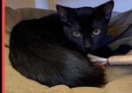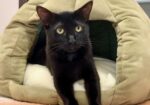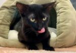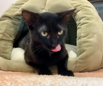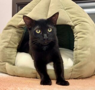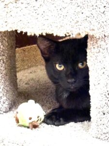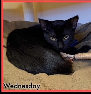Hi, I’m Wednesday. My three brothers and I were five weeks old and hiding in some bushes when we were rescued from an industrial complex. We were dirty and full of fleas, and when we were checked out, we were also found to have an intestinal parasite. We came to SBACC, where we were all cleaned up, and then we went to a foster home, where we got lots of good food, TLC, and medicine to get rid of the nasty parasites. When we returned to SBACC, my three brothers found homes very quickly. I was shy and scared, and spent all my time hiding, so I went back to another foster home for more socialization. I was very scared at first, but my new foster Mom had a lot of patience, and I slowly became more comfortable. This is what she says about me. “She is a very sweet girl who is very timid and needs a lot of time to trust you. She is a beautiful panther-like cat with the smoothest, most velvety fur. She has started to come out of hiding, gathering with the other cats for food, accepting pets and pick-ups (she’s still getting used to it and takes a little bit to relax in your arms). She prefers very gentle pets and scratches, but does not like her hindquarters touched or her tail messed with. She is more approachable at a slow speed with little eye contact. She needs lots of love and will need a quiet home with a patient family who will give her plenty of time to adjust. Having another kitten or young cat in her home would help her feel safer. Once she learn to trust you, she will love you unconditionally.”